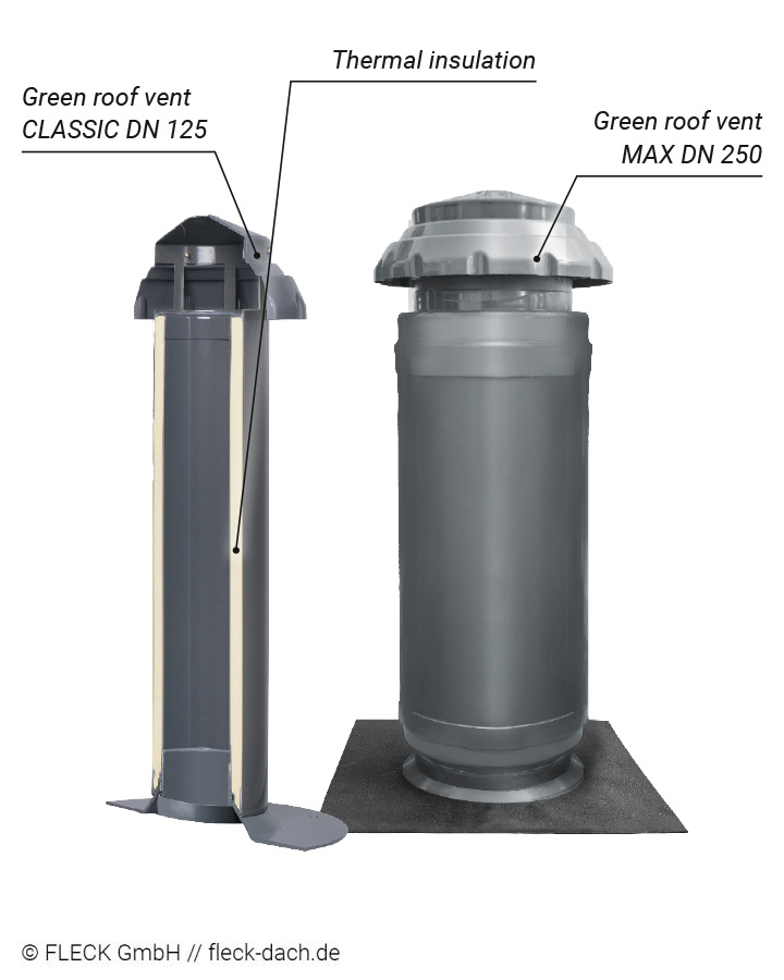 Unique at FLECK: green roof vents with thermal insulation. Thermal bridges and condensation are avoided.