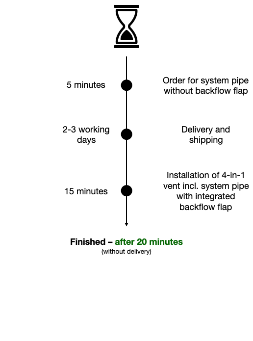The system pipes with backflow flap belong to the optional 4-in-1 flat roof system CLASSIC from FLECK. The 4-in-1 flat roof vent CLASSIC is the preferred vent of roofers and the favourite for new build, modernisation and renovation. The coordinated components make sure that the installation is easier, safer and faster. The vent can be optionally used as: