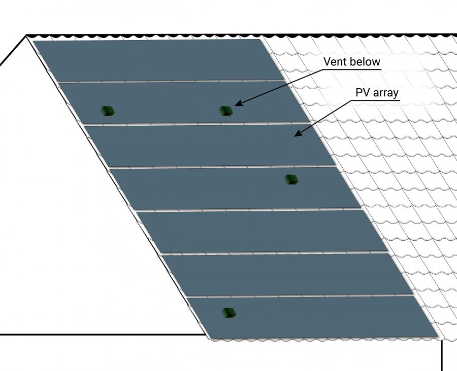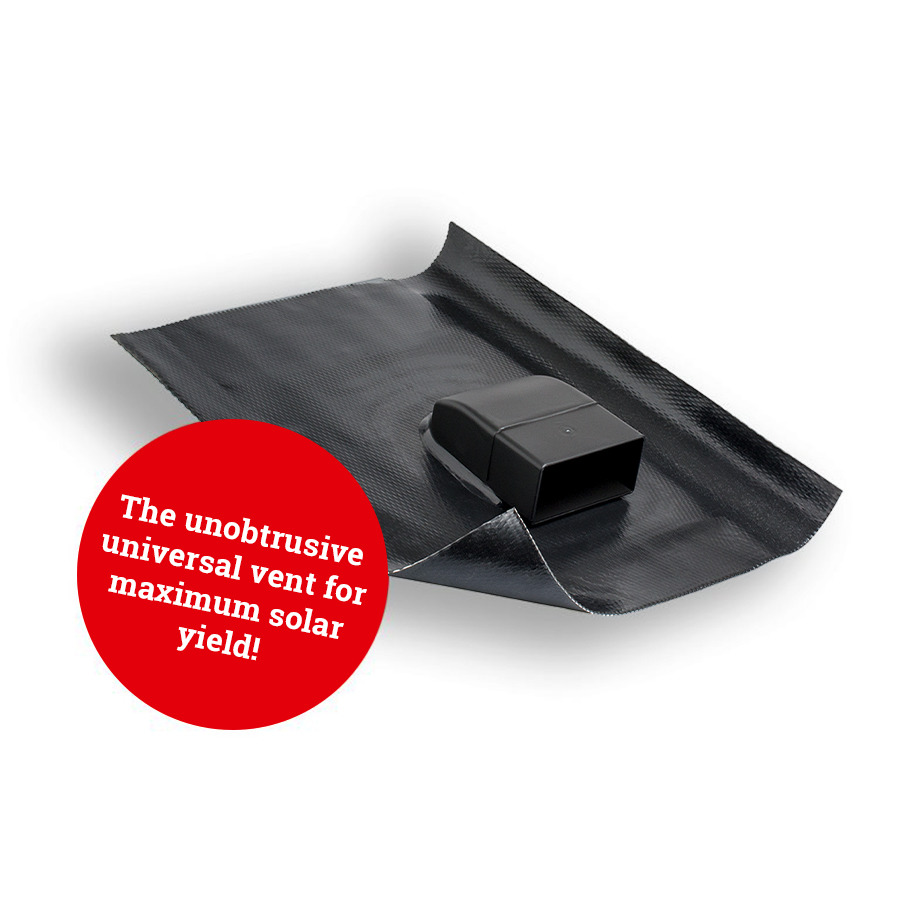 The Saniflex universal vent is the optimum solution for pitched roofs with roof-mounted solar systems. Due to the small overall height, it fits under the solar modules. It is therefore not necessary to exclude any areas when planning the layout of solar modules, because upright vents prevent the laying of the modules. The system planning is simplified and the solar energy yield is increased.
