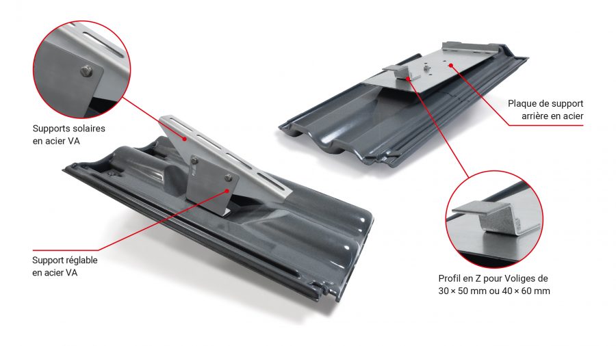 La sous-construction des systèmes solaires est fixée au support en acier VA. À l’arrière de la tuile de support pour produits solaires se trouve une plaque de support de charge en acier galvanisé sur laquelle est fixé un profilé en Z particulièrement stable pour la protection contre l’action du vent. Ce profil permet d’insérer et de visser la tuile dans une volige supplémentaire à installer par le client comme latte de soutien, sans devoir usiner ou adapter les tuiles voisines.