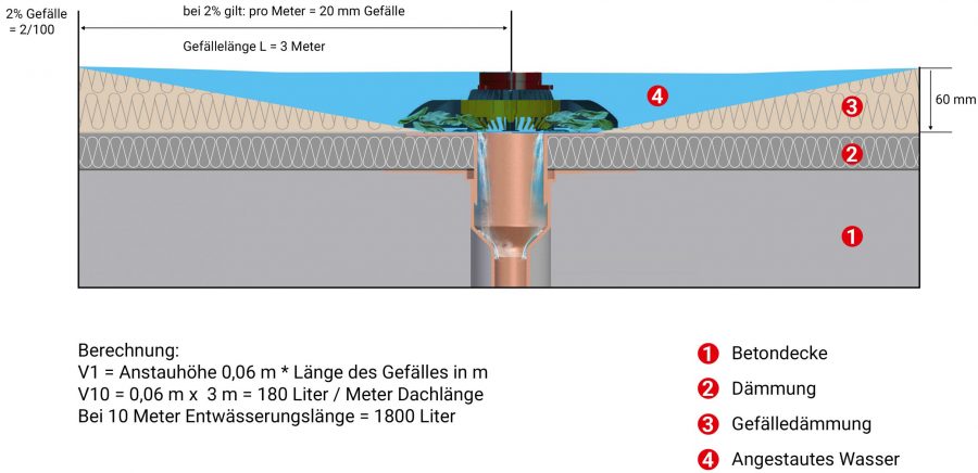 Le cas échéant, il convient de tenir compte, à l’aide de calculs, des quantités d’eau plus importantes qui affluent lorsqu’un ROOFGUARD est ouvert soudainement. Celles-ci sont calculées en multipliant la hauteur d’accumulation au niveau du ROOFGUARD de max. 60 mm par la surface de toit plat sans pente correspondante ou par la surface partielle à drainer dans le cas de toits incliné.