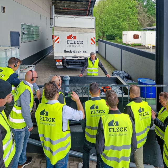 Im Anschluss folgte die theoretische Einführung in unseren Herstellungsprozess, bevor es in das Werk in Oer-Erkenschwick ging, um diesen in der Praxis zu begutachten. Im Zuge der Werksbesichtigung konnten die Teilnehmer des AK Industriedächer auch das Automatik-Laubsieb ROOFGUARD, eine Innovation aus unserem Hause, in Aktion erleben. Peter Nowack hat die Funktionsweise des Produktes beim Vortrag in der BMI Akademie bereits in der Theorie vorgestellt, am Flachdach-Modell wurde diese live demonstriert: Wenn ein Flachdachablauf z. B. durch Laub oder Schmutz verstopft ist und sich das Wasser auf eine Höhe von ca. 60 mm anstaut, löst ein Mechanismus aus und das Laubsieb hebt sich automatisch an. Schmutz und Wasser werden ruckartig die Leitung hinuntergespült und der Ablauf ist wieder frei. Im Anschluss senkt sich das Laubsieb wieder.