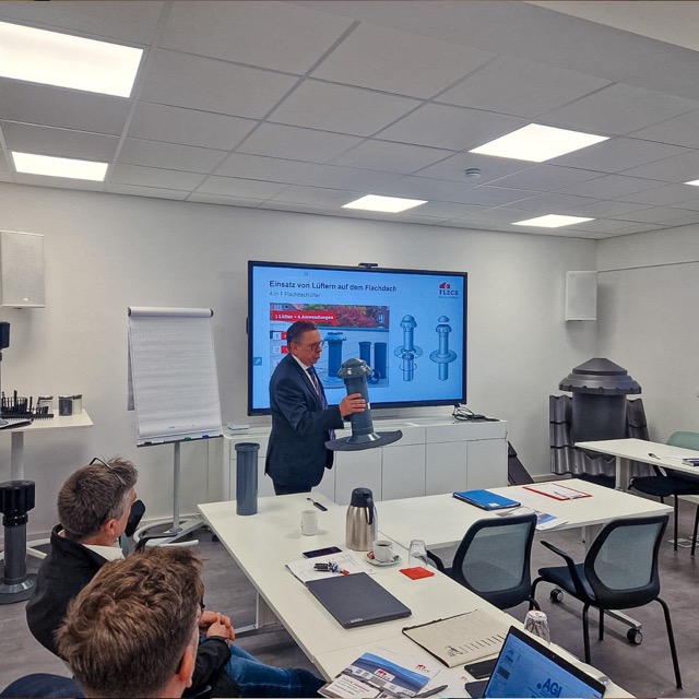 Die Tagung startete mit einer Vorstellung unseres Unternehmens und den neuesten Produktinnovationen, die wir erstmalig auf der DACH+HOLZ in Stuttgart präsentiert haben. „Insbesondere unser neuer Flachdach-Schwanenhals mit Klappelement kam bei den Teilnehmern des Arbeitskreises Industriedächer sehr gut an. Das Produkt ermöglicht die Durchführung starrer Leitungen, z. B. von Klimaanlagen oder Wärmepumpen auf dem Flachdach – Zubehör, welches sich auch vermehrt auf Industriedächern findet“, berichtet FLECK-Geschäftsführer Christoph Nielacny, der den Vortrag gehalten hat.