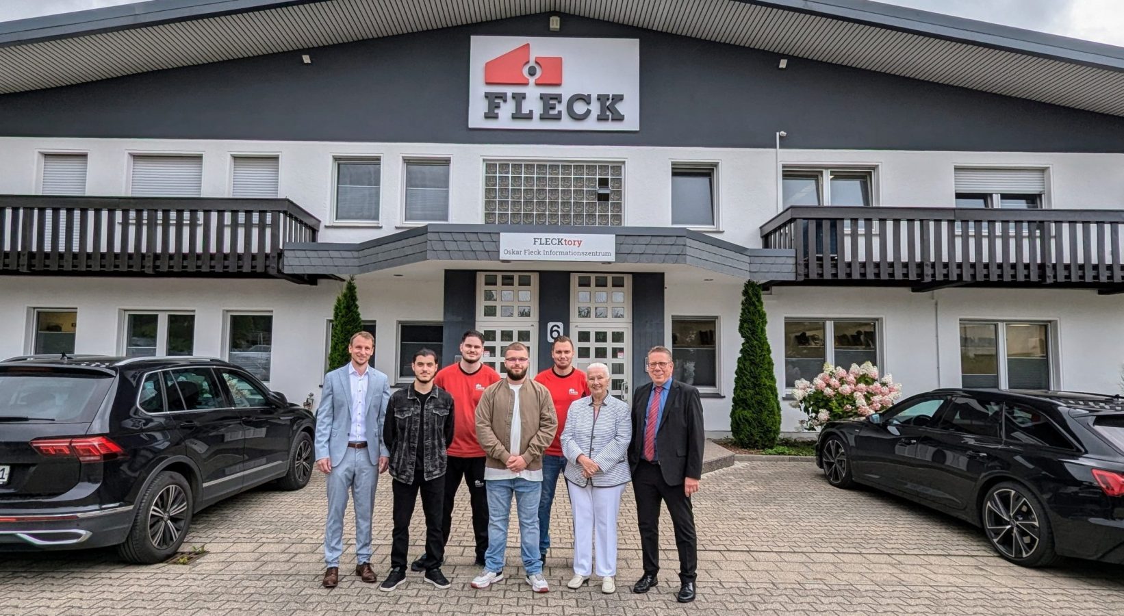 Azubi-Begrüßung in der FLECKtory (v.l.n.r.): Fabian Ewald (technischer Betriebsleiter), Tadevos Melikiyan (Auszubildender), Steven Sielaff (Auszubildender), Robin Gillasamatinow (Auszubildender), Arkadiusz Aftyka (Produktionsleiter Werk Oer-Erkenschwick), Margot Fleck (Vertreterin der Gesellschafter der FLECK-Gruppe) und Christoph Nielacny (Geschäftsführer)