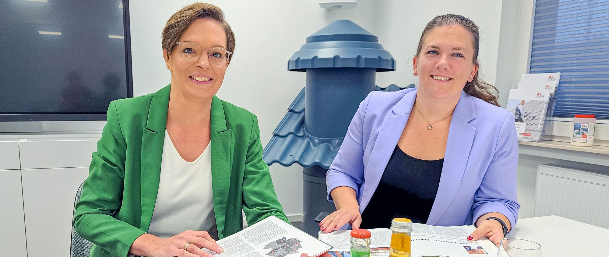 Sylvia Jäger (l.) und Lea Böhm (r.), Assistenz Seminarwesen, beim Blättern im neuen Baustoff-Jahrbuch 2023/2024 des Nachrichtenportals BaustoffMarkt.