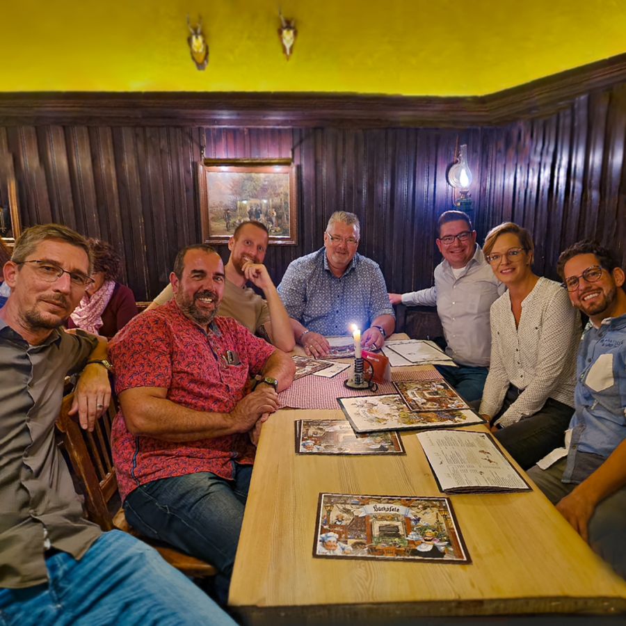 Am ersten Tag kamen die bereits angereisten Kollegen zum gemeinsamen Abendessen zusammen (v. l. n. r.): Alexander Hoffmann, Christian Schwarz, Robert Middeweg, Erik Disselbeck, Daniel Bläsing, Sylvia Jäger und Lars Pompös.