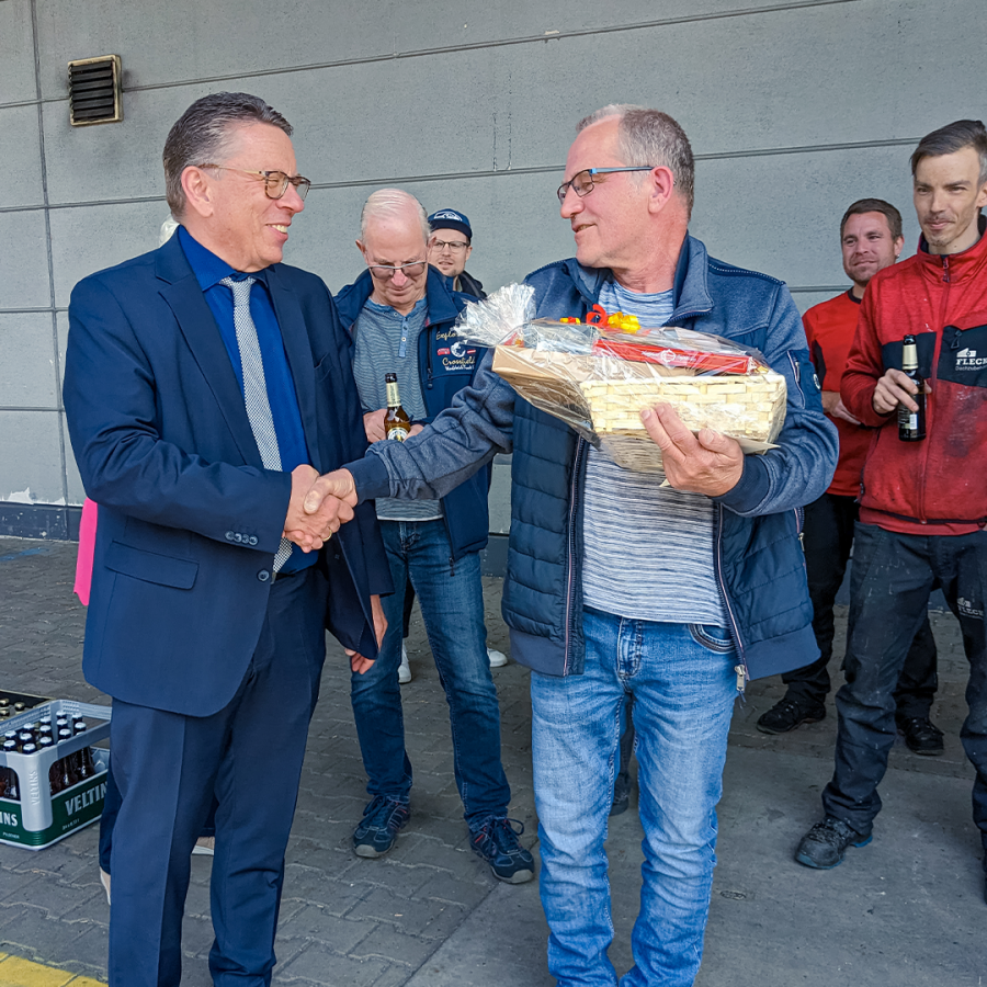 Selbstverständlich schaute auch FLECK-Geschäftsführer Christoph Nielacny (l.) vorbei, um Detlef Hennek (r.) für den bevorstehenden Ruhestand alles Gute zu wünschen.