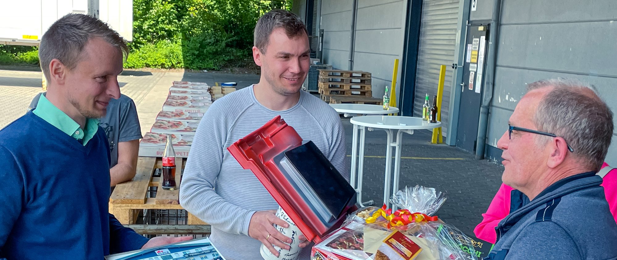 Unser technischer Betriebsleiter Fabian Ewald (l.) und Arkadiusz Aftyka (m.), Produktionsleiter im Werk Oer-Erkenschwick, überreichten Detlef Hennek (r.) anlässlich des bevorstehenden Ruhestandes einen Präsentkorb sowie eine Spardose im Design eines Sani Extra Pfannenlüfters.
