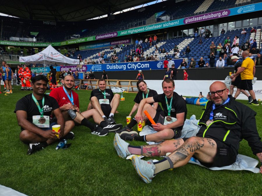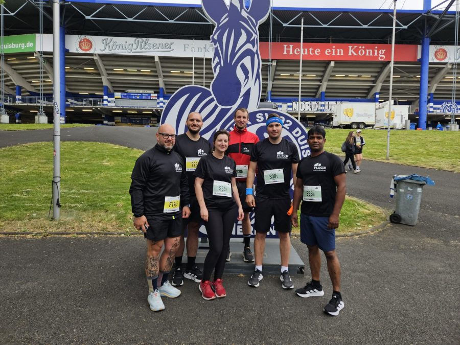 „Die Anreise hatte jeder für sich organisiert und wir haben uns in Duisburg getroffen“, erinnert sich Teamassistentin Deborah Kaps, die im Team der Staffel mitgelaufen ist. „Die Starternummern hatte ich bereits am Vortag für alle FLECK-Teilnehmenden abgeholt, sodass wir vor dem Start keinen Stress hatten. Auch trugen wir alle einheitliche Trikots mit unserem Firmenlogo.“