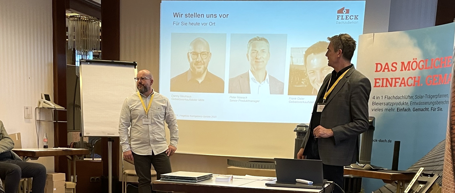 Im Rahmen des Kompetenzupdates präsentierten unser Senior Produktmanager Peter Nowack und Gebietsverkaufsleiter Danny Neuhaus die neuesten Produkte von FLECK in den Bereichen Sanierung, Wartung, Gründach und Solar. „Gründächer spielen eine zunehmend wichtige Rolle. Deshalb haben wir unsere Produktpalette erweitert und neue Lösungen entwickelt, die wir auch in unsere Preisliste 2025 aufgenommen haben. Zu den neuen Produkten im Gründachsegment gehören der Gründachlüfter CLASSIC (DN 125), der Gründachlüfter MAX (DN 250), der Flachdach-Universalkiesfang RINGO sowie die Retentionsdrossel und die ReDro-Box“, erklärt Danny Neuhaus.