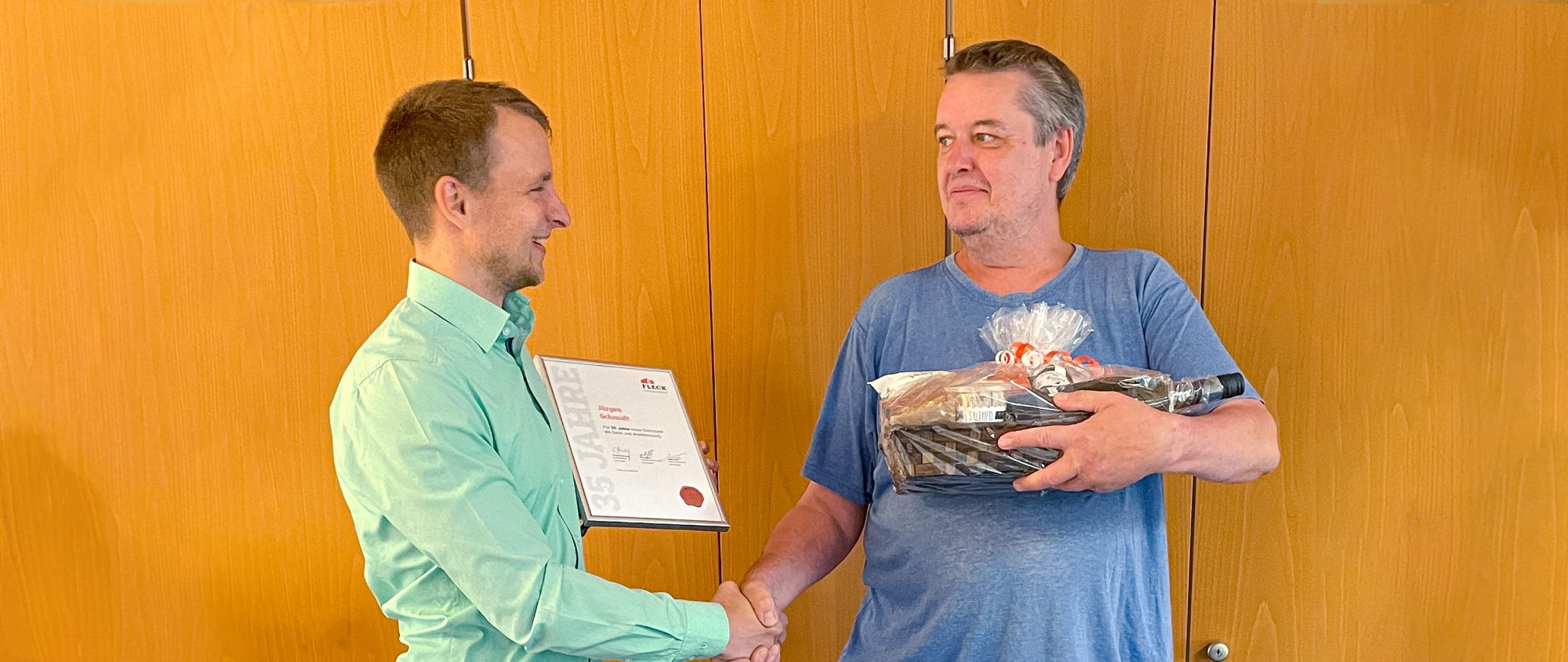 Unser technischer Betriebsleiter, Fabian Ewald (l.), überreichte Jürgen Schmidt (r.) anlässlich des Jubiläums den „traditionellen“ Präsentkorb sowie die dazugehörige Urkunde.