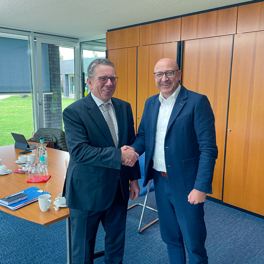 Für den Einkaufsverbund CC-GmbH fand das Jahresgespräch in Hamm bei der DEG Dach-Fassade-Holz eG statt. Hierbei stimmte sich Christoph Nielacny mit Dirk Bollhorst (r.), Leiter Produktmanagement, zu Marketing- und Vertriebsaktionen ab.