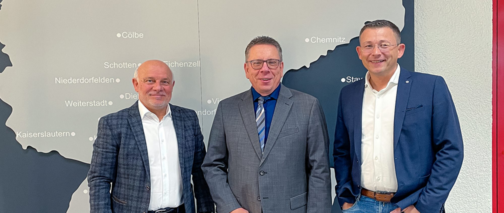 Bei der Dachdecker-Einkauf Süd eG in Mannheim sprach FLECK-Geschäftsführer Christoph Nielacny (m.). mit Einkaufsleiter Thomas Rachel (l.) und dem Leiter E-Commerce und Produktmanagement, Alexander Sels (r.).