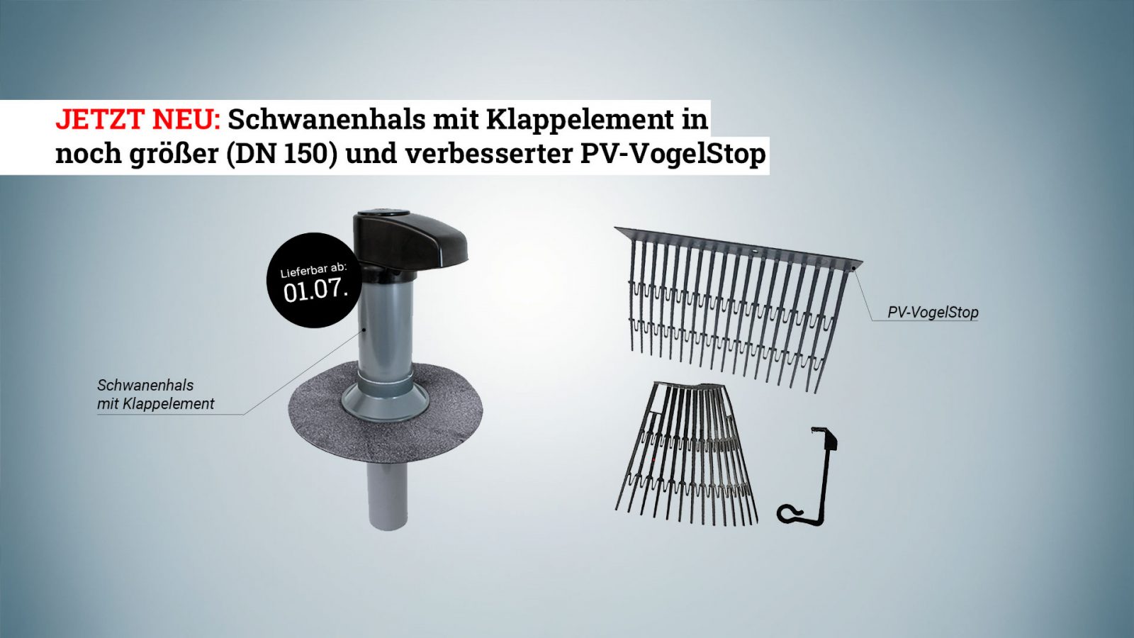 Neue FLECK-Produktentwicklungen: Schwanenhals mit Klappelement in noch größer (DN 150) und optimierter PV-VogelStop.