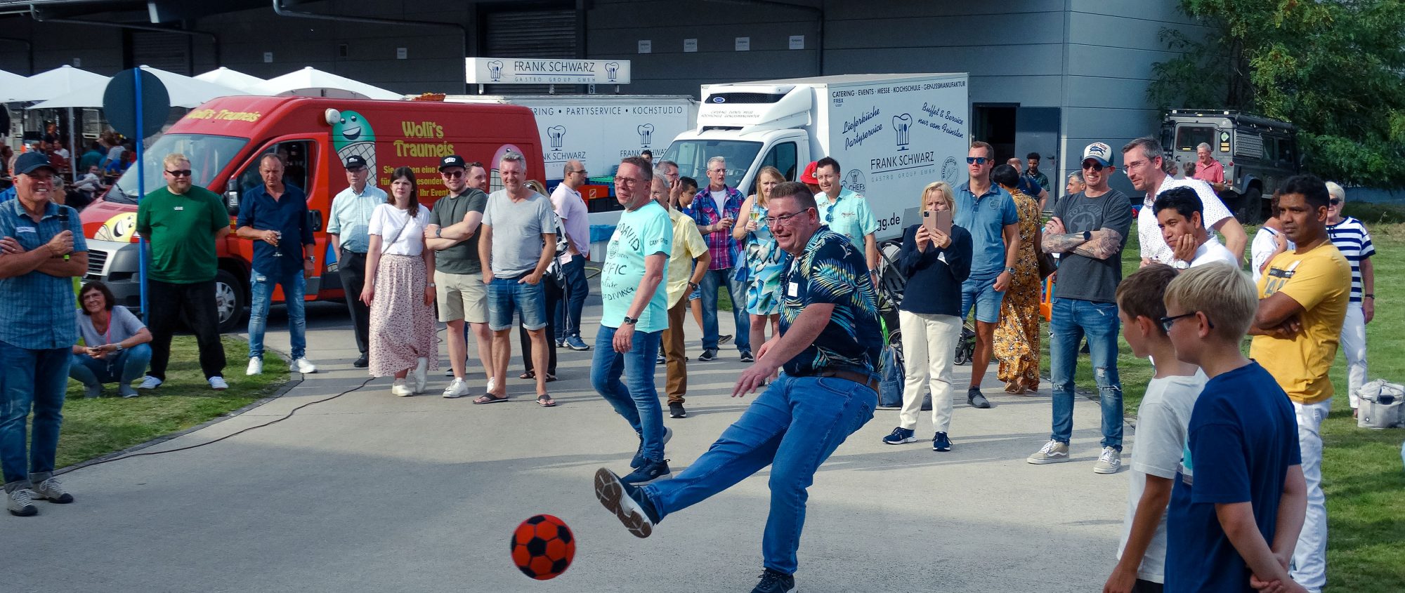 Sommerfest 2023 bei FLECK: Ein abwechslungsreiches Rahmenprogramm, sportliche Wettbewerbe (hier: Daniel Bläsing (m.)) und handgemachte Live-Musik sorgten für ein unvergessliches Fest.