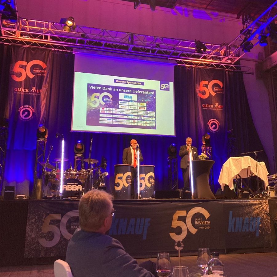 FLECK hat die Jubiläumsfeier von BAUVISTA mit einem Sponsoring unterstützt. Hier im Bild: Johannes Häringslack (l.) und Jörg Kronenberg (r.), Geschäftsführer der BAUVISTA, bei der Eröffnungsrede.