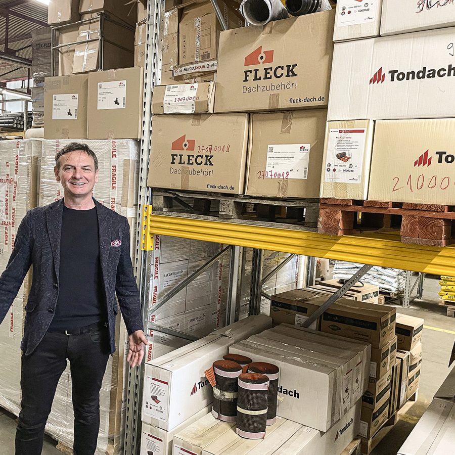 Neben dem 4 in 1 Flachdachlüfter CLASSIC finden sich im Lager von Tondach weitere Produkte von FLECK, wie Tondach-Geschäftsführer Jasmin Hošo hier im Bild zeigt.