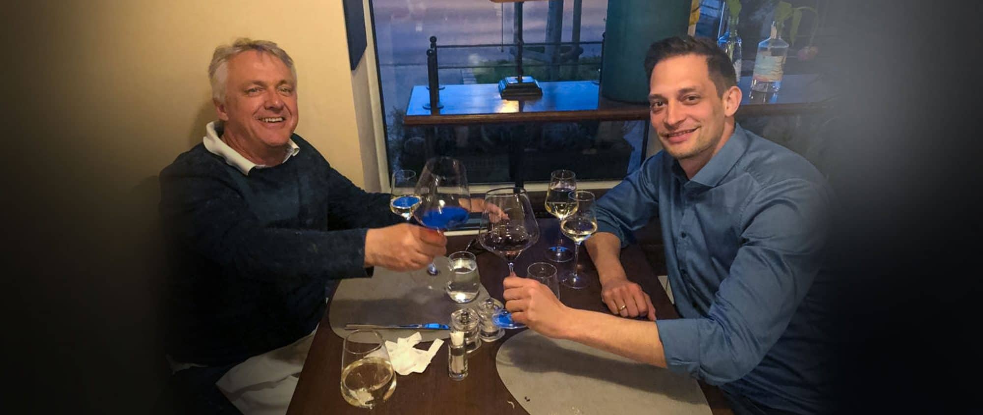 Wertschätzung: Gemeinsames Abendessen mit Leo Heiszl (l.), Geschäftsführer Blacktop GmbH Buchkirchen, einem Handelspartner von uns und Florian Kurzbauer (r.).