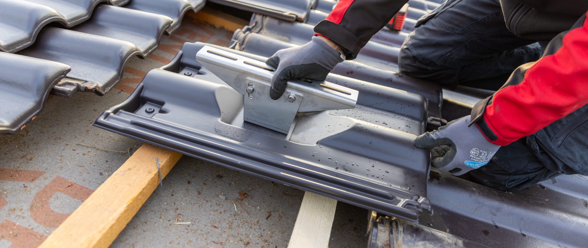 Auch das Material überzeugt. „Wir verbauen für unsere Kunden nur äußerst langlebige und zuverlässige Produkte“, sagt Martin Böttcher. „Denn nur so können wir dem hohen Anspruch an uns selbst gerecht werden.“ Die formstabilen Solar-Trägerpfannen von FLECK bestehen aus hochwitterungsbeständigem Hart-PVC mit UV-beständiger Farbbeschichtung – passend zur gewählten Dacheindeckung. Die abgewinkelte, rückseitig angebrachte und lastabtragende Trägerplatte ist eine stabile, verzinkte Stahlplatte und wird durch ein massives Z-Profil zur Windsogsicherung ergänzt. Die außenliegende Solar-Montagehalterung besteht aus hochfestem VA-Edelstahl. „Solar-Trägerpfannen von FLECK ermöglichen nicht nur uns einen zügigen Einbau“, so Martin Böttcher. „Auch das Unternehmen, das für die Installation der Technik der Solaranlage zuständig ist, profitiert davon.“