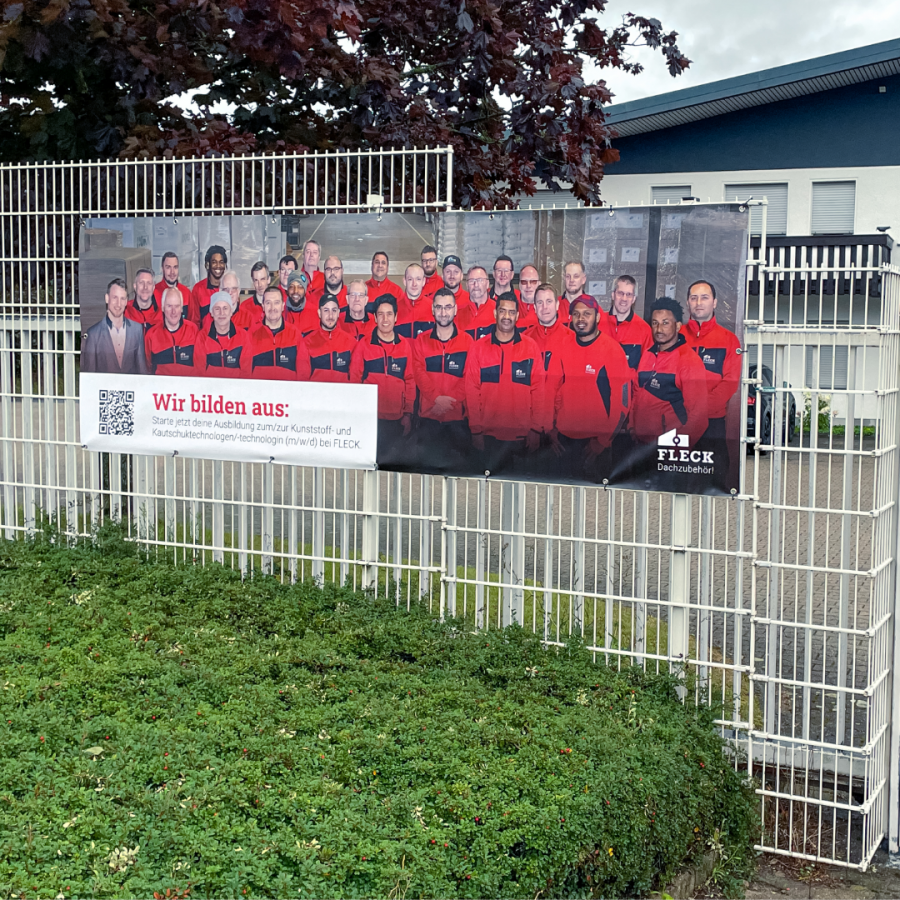 FLECK suchte u. a. mit diesen Zaunbannern an beiden Standorten nach Auszubildenden.