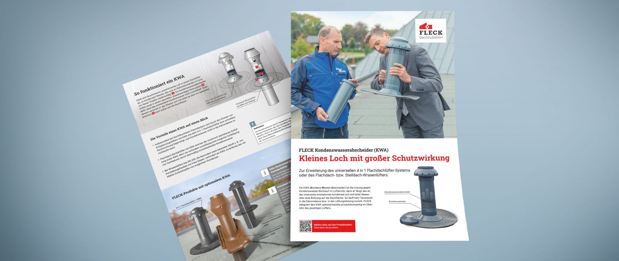 Die Funktionsweise eines Kondenswasserabscheiders wird in dem Flyer anschaulich anhand von Grafiken erklärt. Darüber hinaus finden Dachhandwerker:innen und Händler:innen darin auch alle Vorteile eines Kondenswasserabscheiders auf einen Blick. Der Flyer ist jederzeit über den Download-Bereich von FLECK abrufbar.