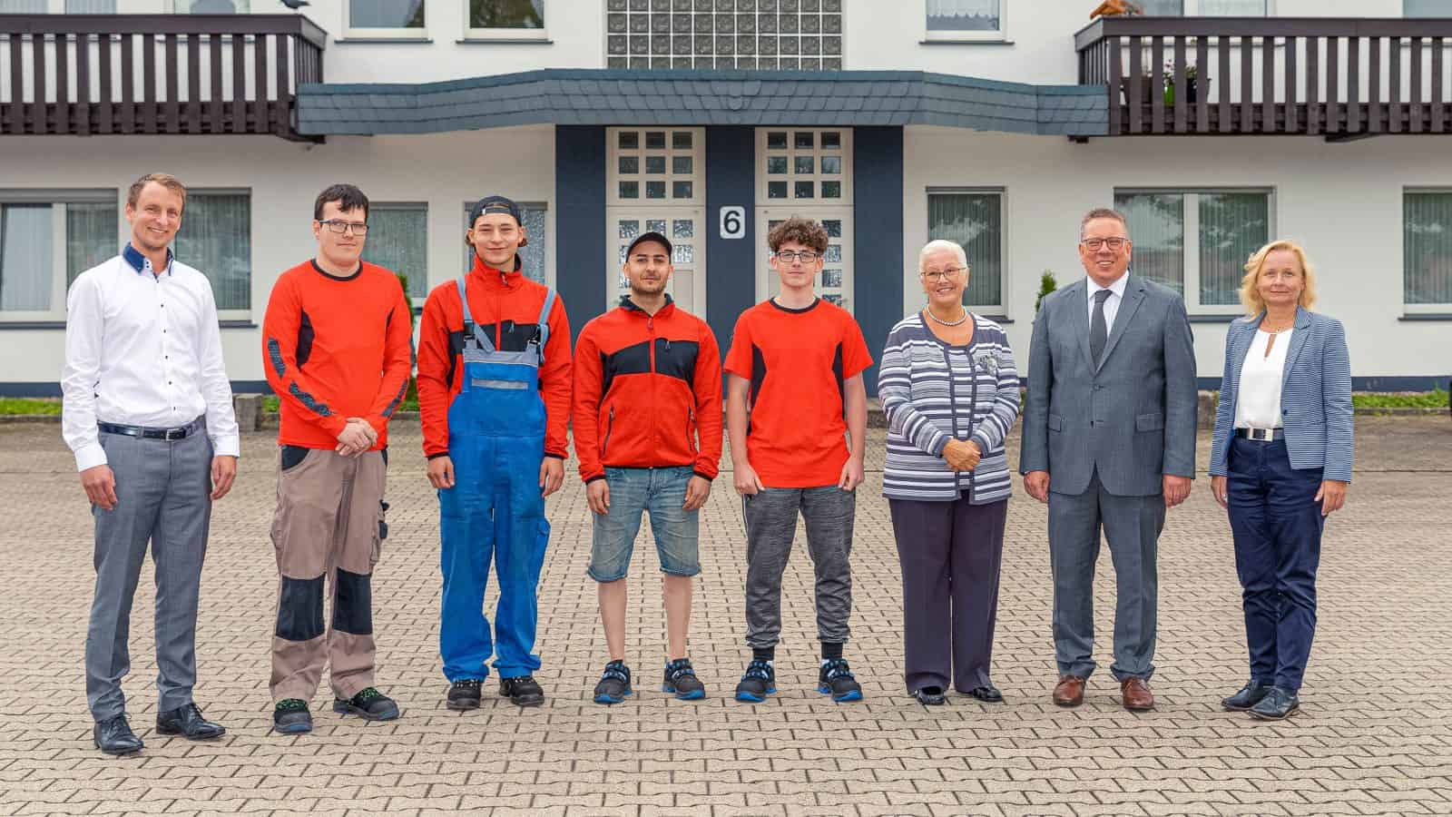 Neue Auszubildende bei FLECK: (v.l.) Fabian Ewald, die Auszubildenden Marvin Multhaupt, Samet Pamuk, Mohammed Othmann Abdalrahman, Joel Nickel, Gesellschafterin Margot Fleck, Christoph Nielacny und Andrea Betz.