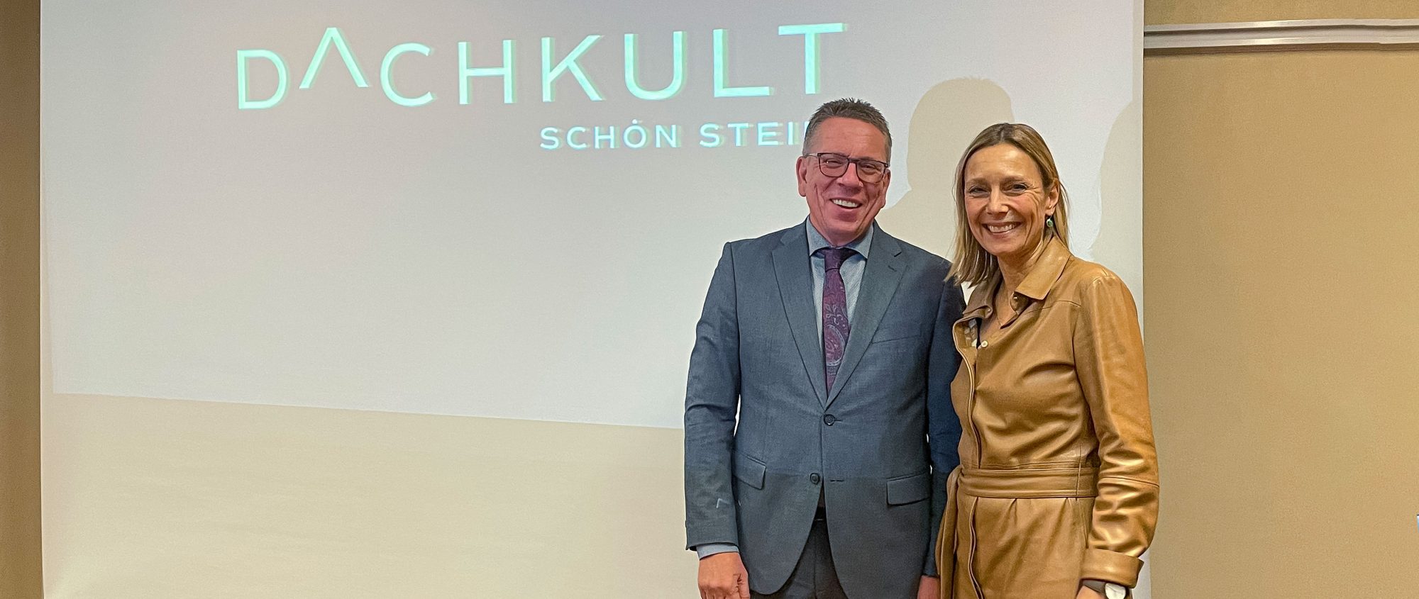 FLECK-Geschäftsführer Christoph Nielacny (l.) mit Petra Schumacher (r.), Sprecherin der Initiative Steildach/DACHKULT, bei der Neugründung der Initiative.