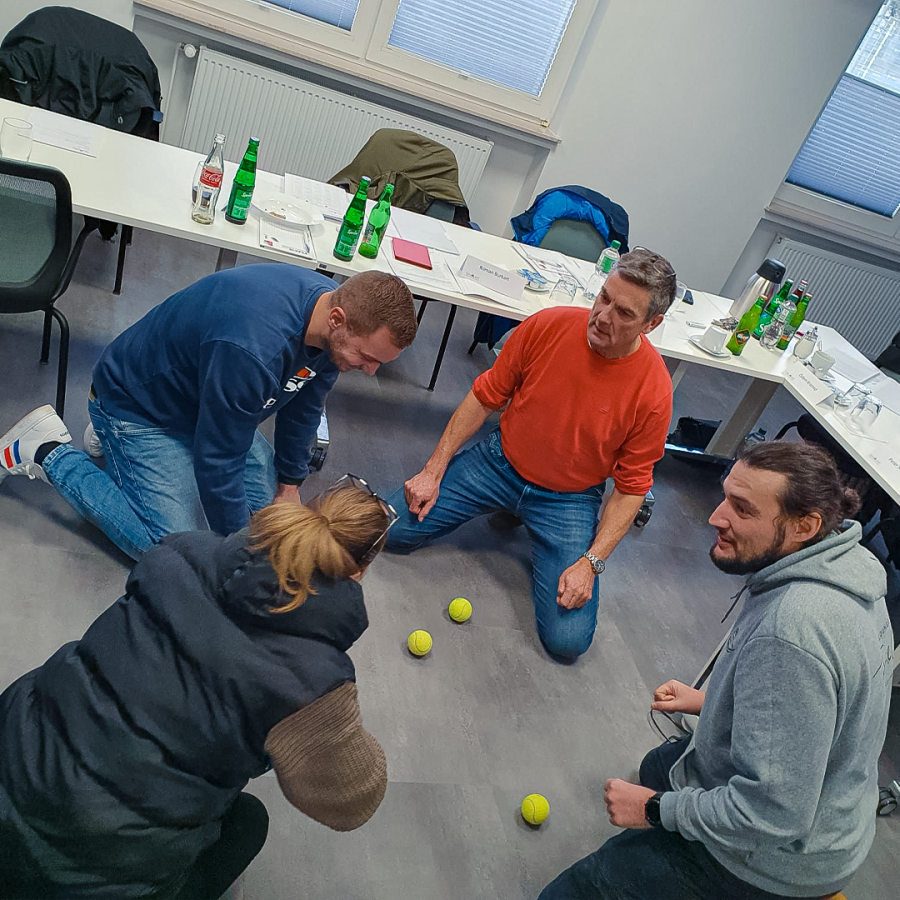 Bei dieser Übung musste ein Tennisball in möglichst kurzer Zeit durch alle Hände des Teams bewegt werden. Hier präsentieren (v. l. n. r.) Özlem Krasniqi, Arkadiusz Aftyka, Peter Nowack und Adrian Burkart ihre Strategie.