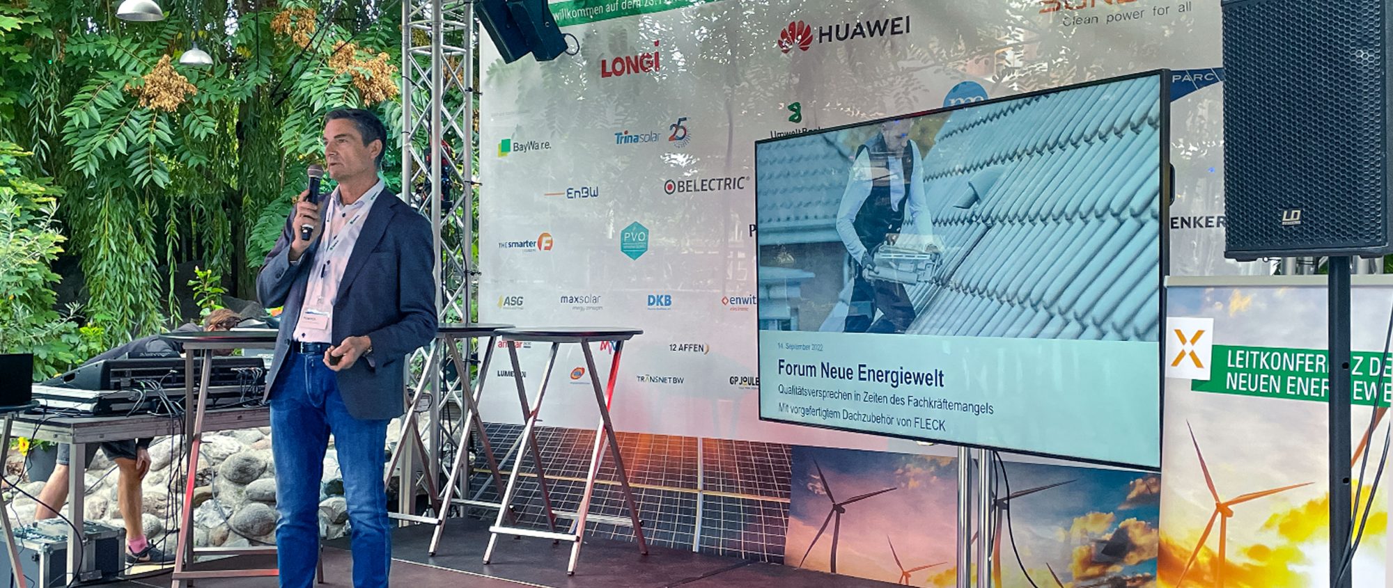 FLECK-Produktmanager Peter Nowack war am 14. September beim Forum Neue Energiewelt als Referent auf der Bühne zu sehen. In seinem Vortrag zeigte er den Teilnehmer:innen u. a. wie sich die FLECK-Solarträgerpfannen, Solar-Durchgangspfannen und Dachpfannen für Dachbegehungssysteme sparrenunabhängig und besonders schonend für das Dach verlegen lassen – ein Vorteil, den kaum ein anderes Produkt bietet.