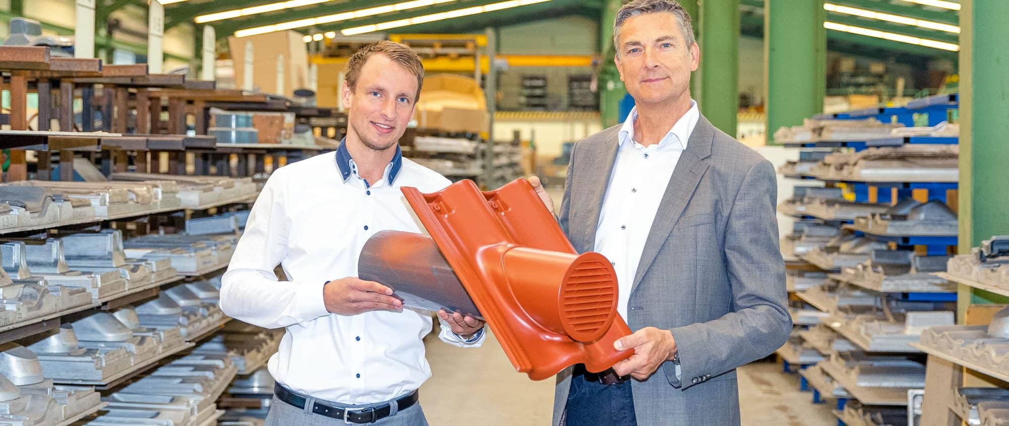Der technische Leiter bei FLECK, Fabian Ewald (l.), und Produktmanager Peter Nowack (r.) freuen sich, mit der horizontalen Dachdurchführung dem Markt eine weitere Innovation präsentieren zu können.