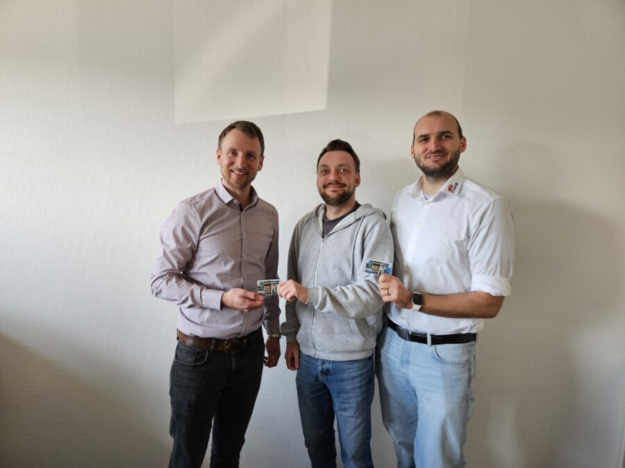 Unser Technischer Betriebsleiter, Fabian Ewald (l.), bei der Übergabe der Gewinne der Jahresendtombola – Tankgutscheine im Wert von je 150,00 Euro – an zwei der Gewinner: Max Schnatmann (m.) und Roman Burkart (r.).