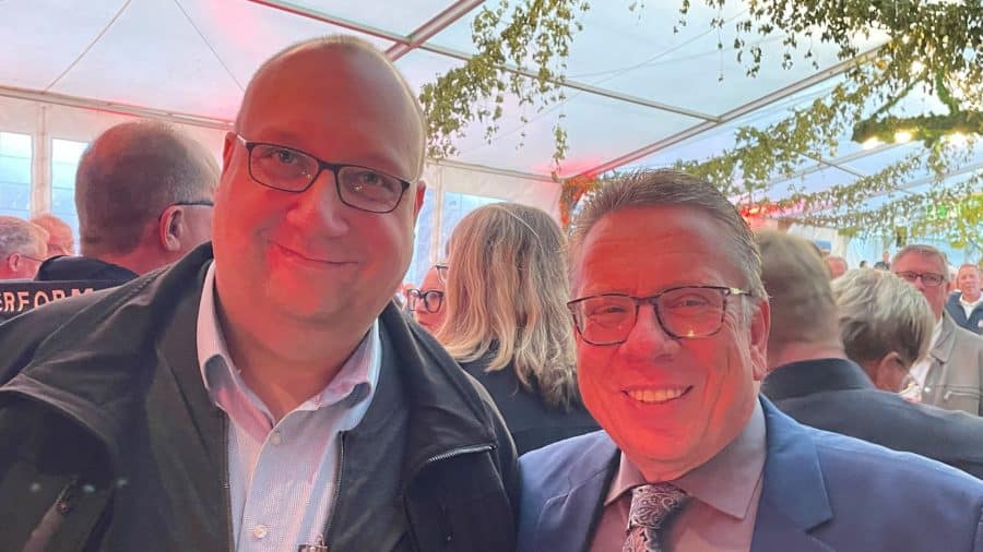 Im sauerländischen Eslohe– mit fast 400 weiteren Gästen aus der Bedachungsbranche – konnten unser Gebietsverkaufsleiter West II, Alexander Hoffmann, und unser Geschäftsführer Christoph Nielacny Ende September gleich zwei Geburtstage feien. „Das Herzstück“, so „Kalle“ (Karl-Heinz) Ester, Vorsitzender des Vorstandes des Innungsverbandes des Dachdeckerhandwerks Westfalen, „unserer westfälischen Berufsorganisation“, die Lorenz-Burmann Dachdeckerschule in Eslohe und die Vereinigung ehemaliger Schüler der Dachdeckerfachschule Eslohe e.V. feierten nämlich ihr 75-jähriges Jubiläum.