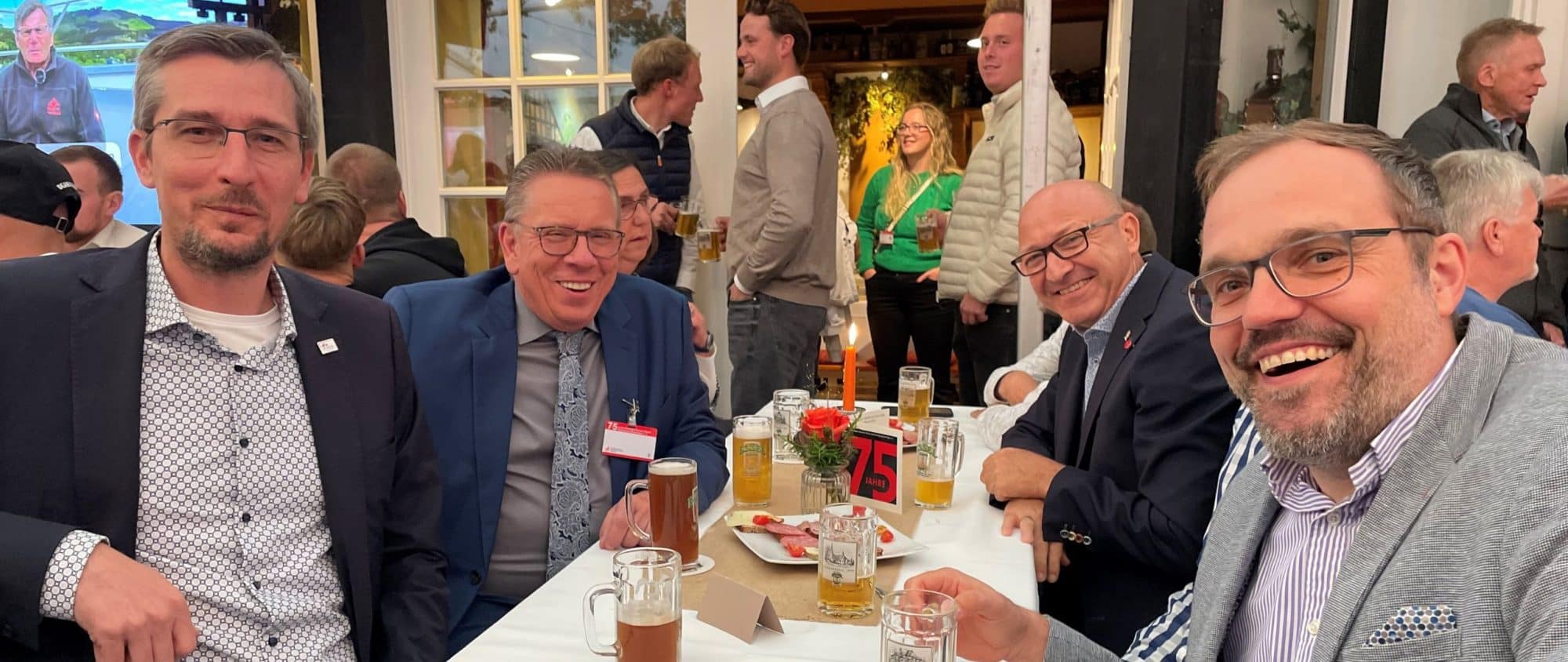 Im sauerländischen Eslohe– mit fast 400 weiteren Gästen aus der Bedachungsbranche – konnten unser Gebietsverkaufsleiter West II, Alexander Hoffmann, und unser Geschäftsführer Christoph Nielacny Ende September gleich zwei Geburtstage feien. „Das Herzstück“, so „Kalle“ (Karl-Heinz) Ester, Vorsitzender des Vorstandes des Innungsverbandes des Dachdeckerhandwerks Westfalen, „unserer westfälischen Berufsorganisation“, die Lorenz-Burmann Dachdeckerschule in Eslohe und die Vereinigung ehemaliger Schüler der Dachdeckerfachschule Eslohe e.V. feierten nämlich ihr 75-jähriges Jubiläum.