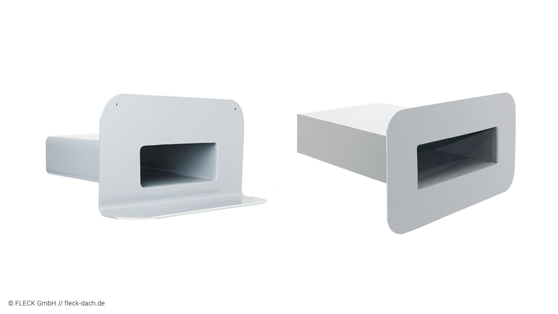De flensmanchetten van de rechthoekige noodoverlopen voor platte daken van FLECK zijn optioneel ook verkrijgbaar in bitumenbanen of kunststof- resp. elastomeer-dakbanen.