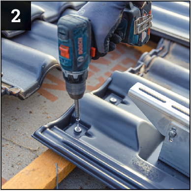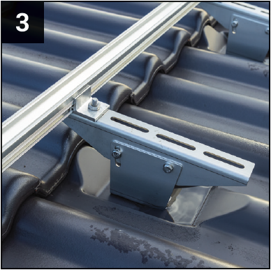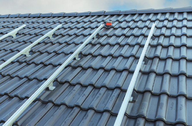 De onderconstructie van de zonnesystemen wordt bevestigd aan de roestvrijstalen beugel. Aan de achterkant van de zonnesteunpan is een dragende plaat van gegalvaniseerd staal aangebracht, waaraan een bijzonder stabiel Z-profiel is bevestigd voor bescherming tegen windzuiging. Met behulp van dit profiel wordt de dakpan in een extra daklat geschoven om ter plaatse als steunlat te worden bevestigd, zonder dat de dakpannen eromheen hoeven te worden bewerkt of aangepast.