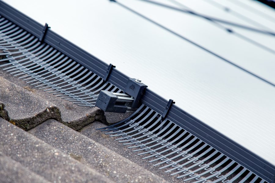 De PV-VogelStop wordt eenvoudig met clips aan de rand van het fotovoltaïsche systeem bevestigd.