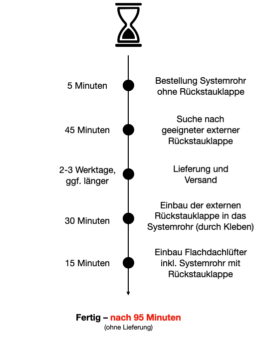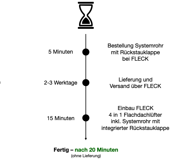 Eine Rückstauklappe wird nur beim Einsatz von motorisch betriebenen Lüftungen empfohlen. Bei FLECK wird die Rückstauklappe bei Bedarf in die Systemrohre für den 4 in 1 Flachdachlüfter CLASSIC bereits integriert. Der Mehraufwand für den nachträglichen Einbau entfällt. Die Systemrohre werden vormontiert geliefert. Das spart nicht nur beim Transport und Einbau Zeit, sondern auch beim Suchen und Beschaffen der Materialien. Die gewonnene Zeit kann optimal für andere Arbeiten genutzt werden. Zusammen mit dem 4 in 1 Flachdachlüfter CLASSIC von FLECK ergibt sich eine unschlagbare Symbiose. Auf Wunsch sind die Systemrohre bei FLECK auch mit Wärmedämmung erhältlich.
